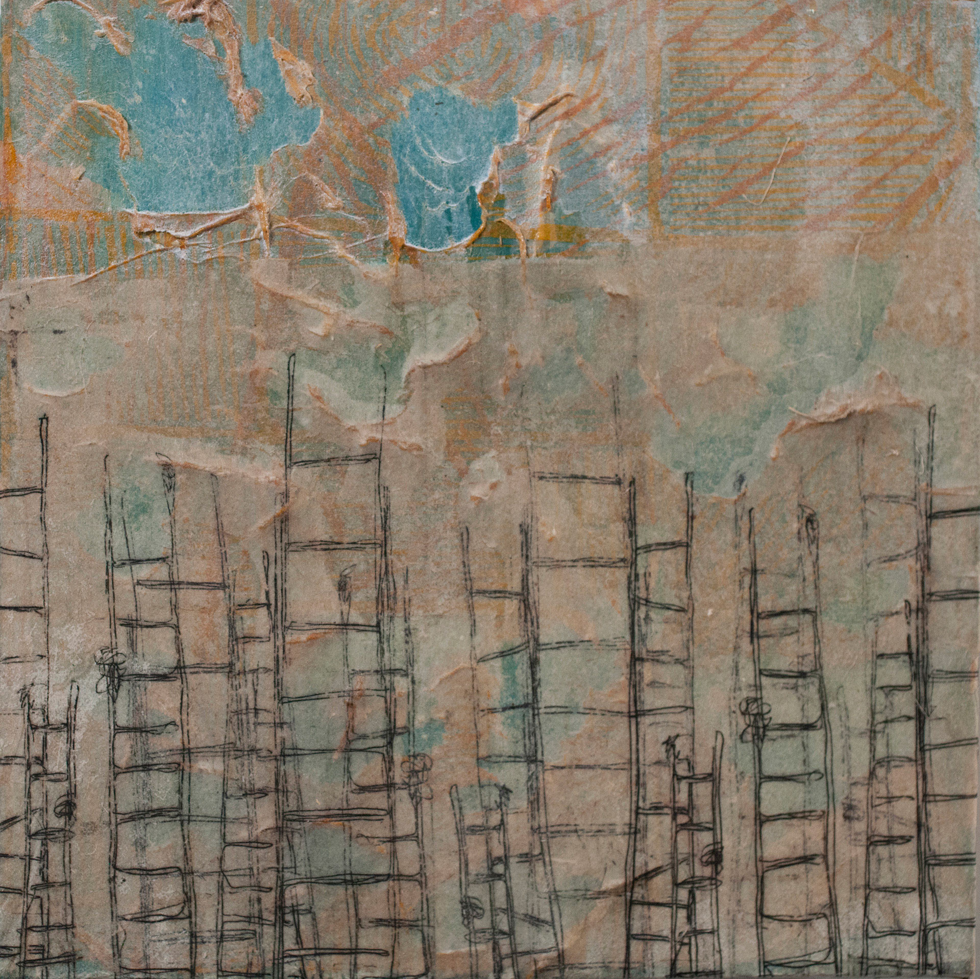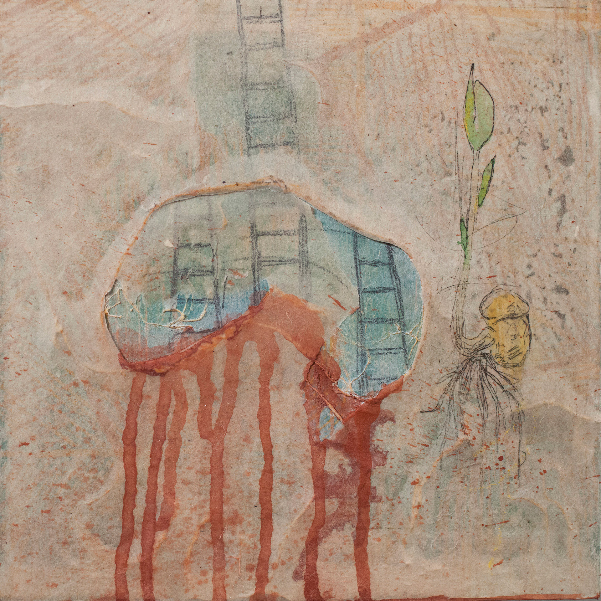 Unknown Possibilities, Softground Etching, Copper Relief, Tea Stained Paper, 8x10" 2023