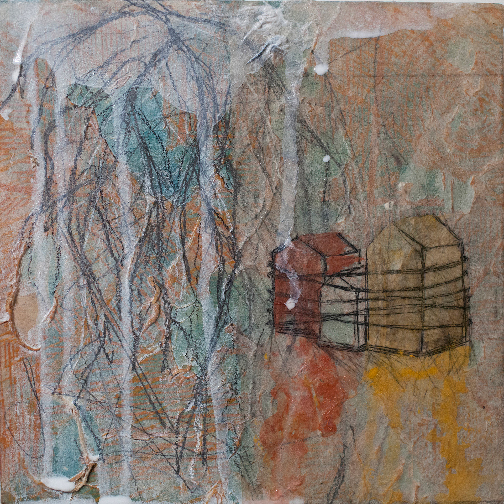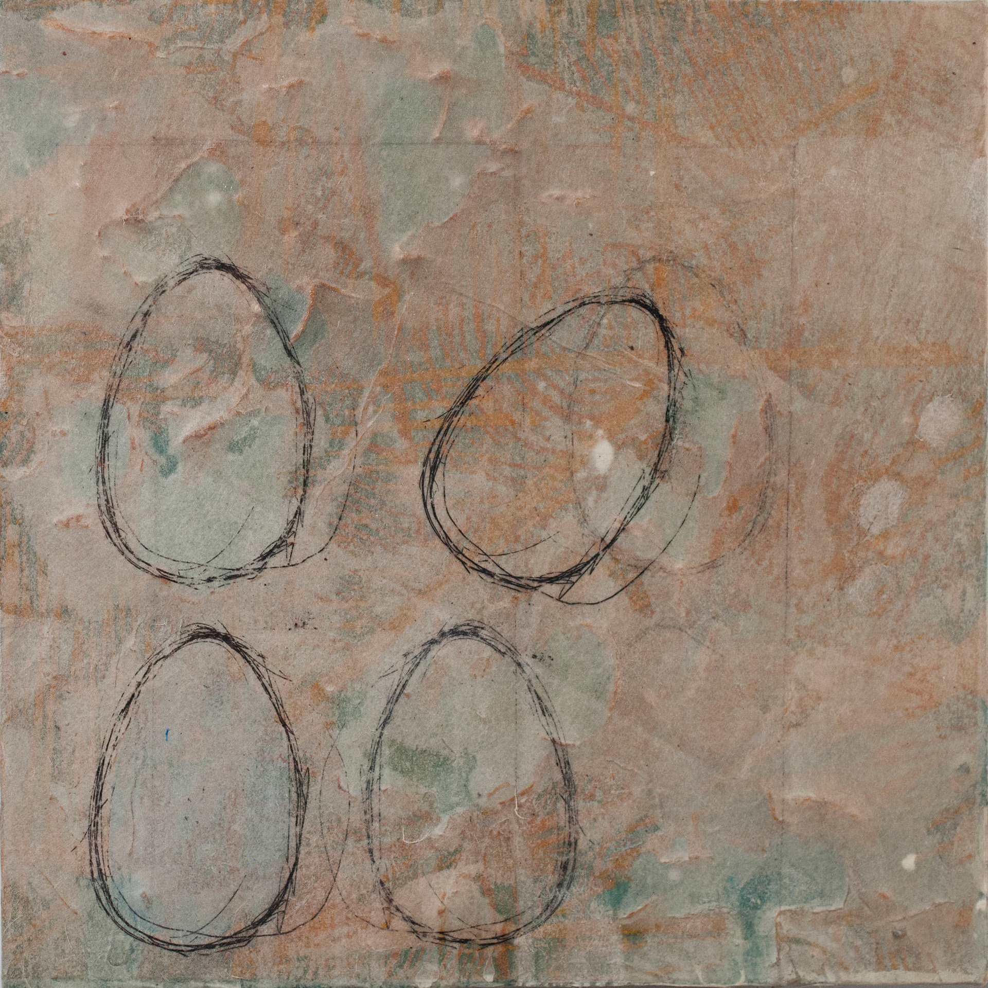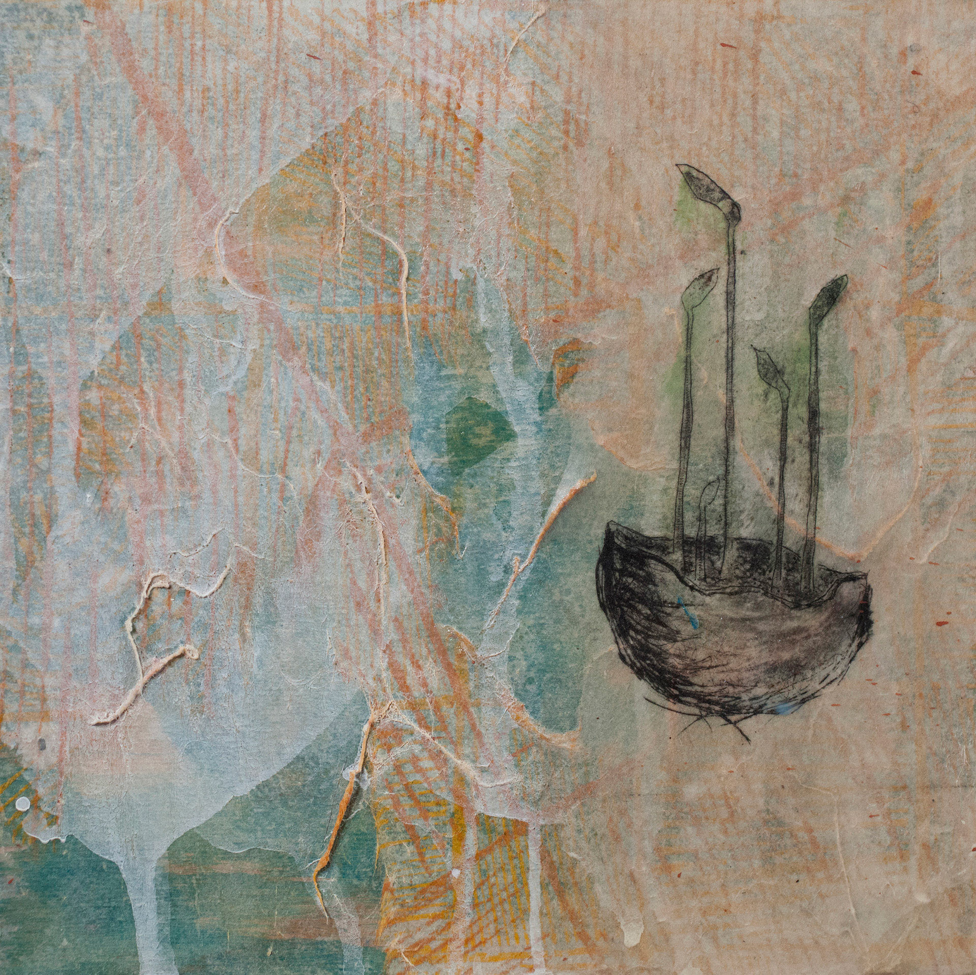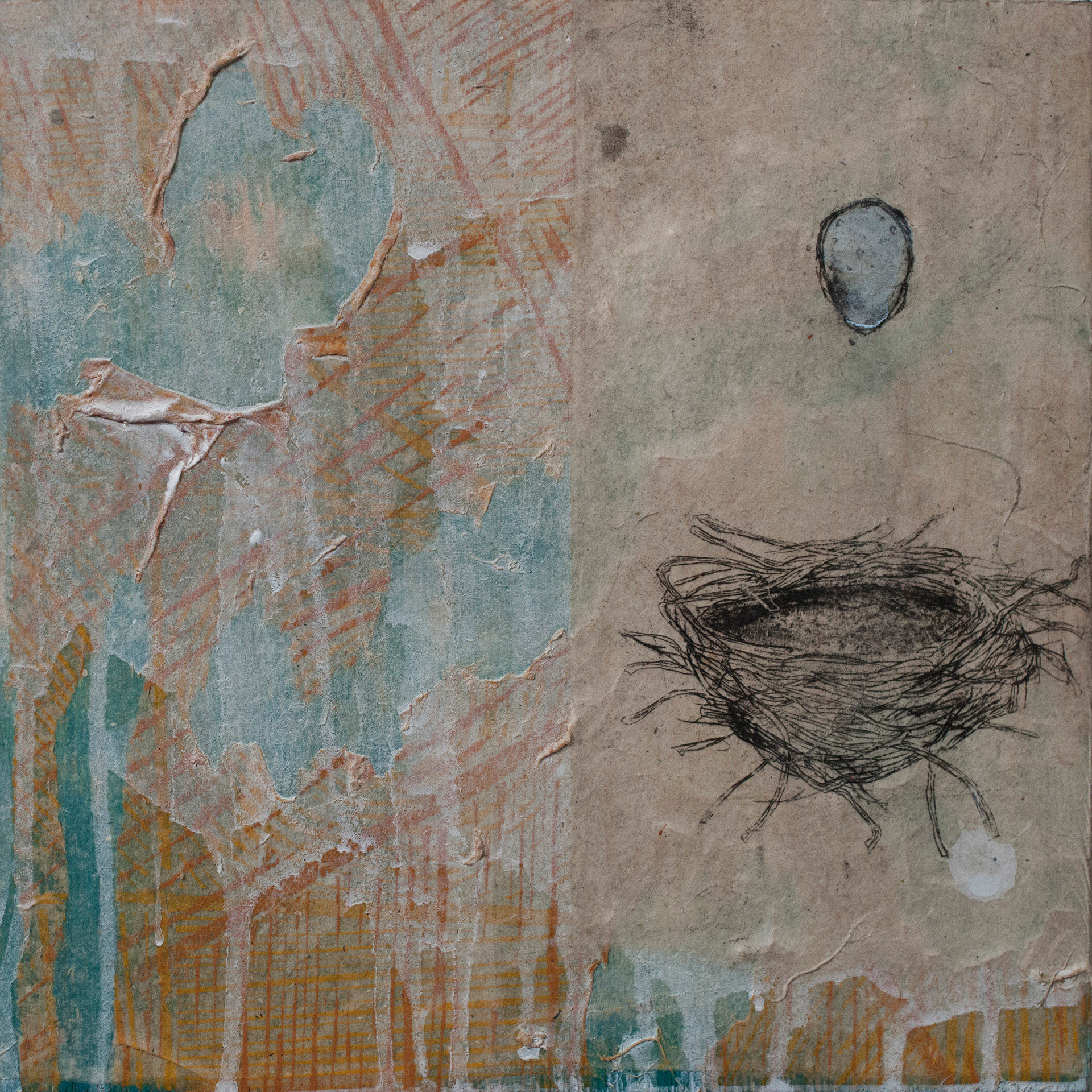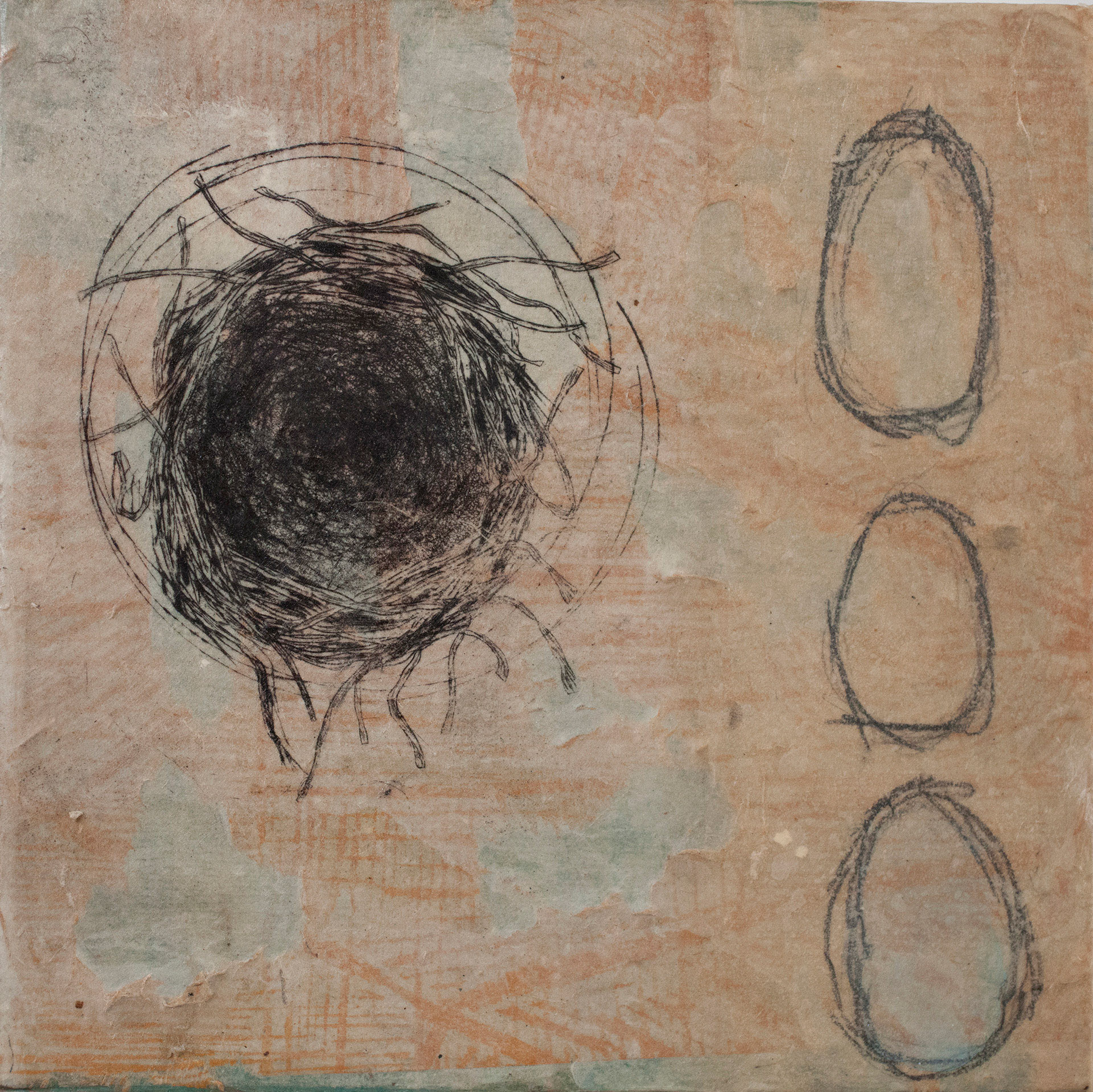 Nesting: Possibilites, Etching, Copper Relief, Wax Pastel, Tea Stained Paper, 8x10", 2023